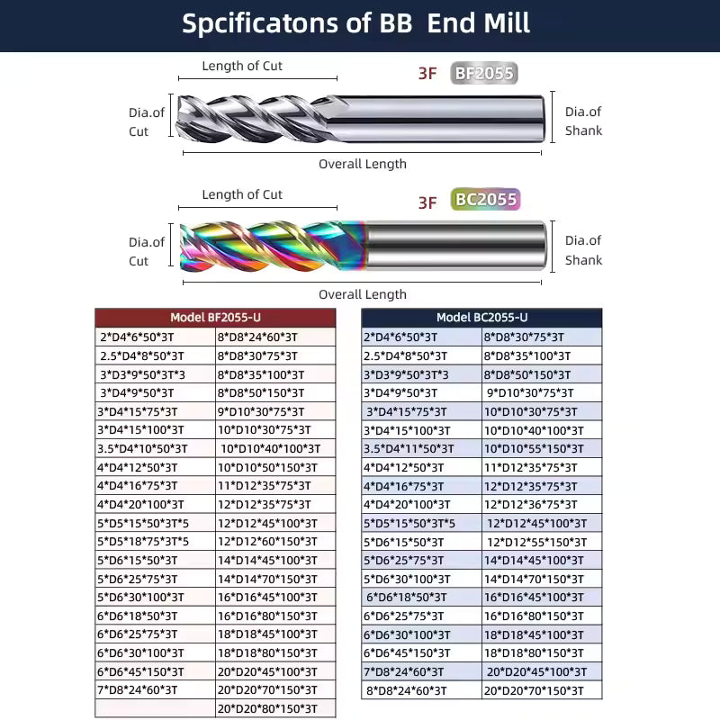 Les fraises à 3 cannelures BB sont utilisées dans le traitement de l'aluminium et du cuivre, elles permettent d'atténuer efficacement les vibrations et d'obtenir une coupe stable.
