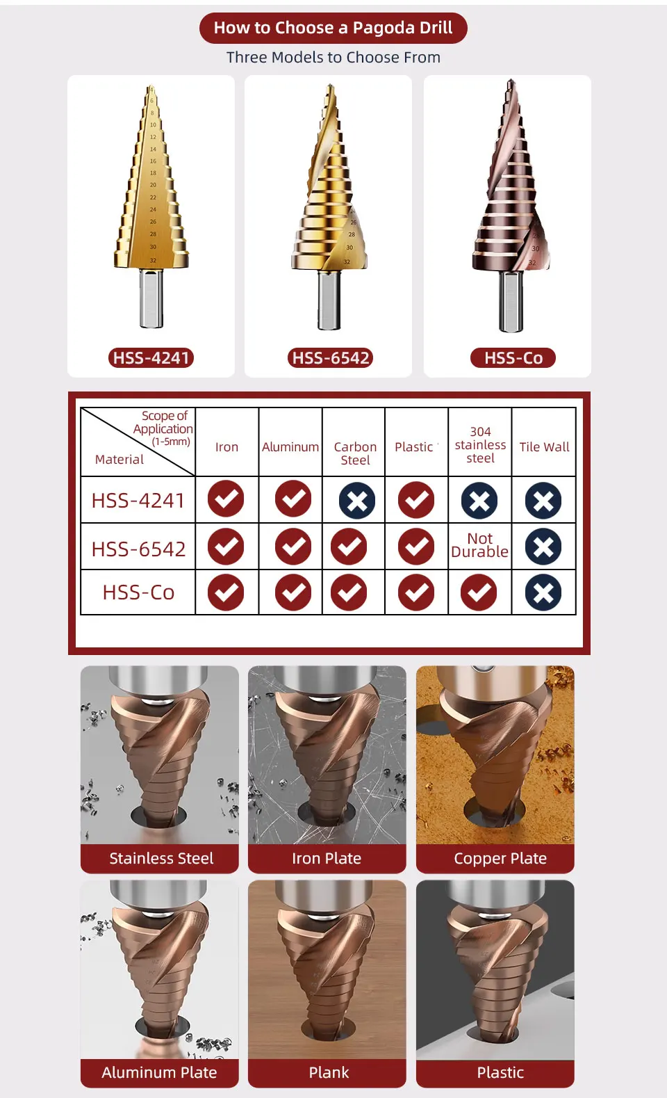 HSS: Used for wood, plastic, PVC,aluminum, copper, iron within 2mm, steel, etc. HRC<20