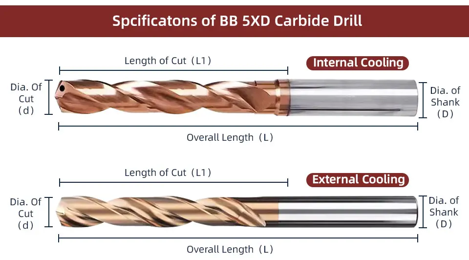 Please note that there are two types of drill bits: internal cooling (with cooling holes) and external cooling (without cooling holes). Please be careful to select when placing an order.
