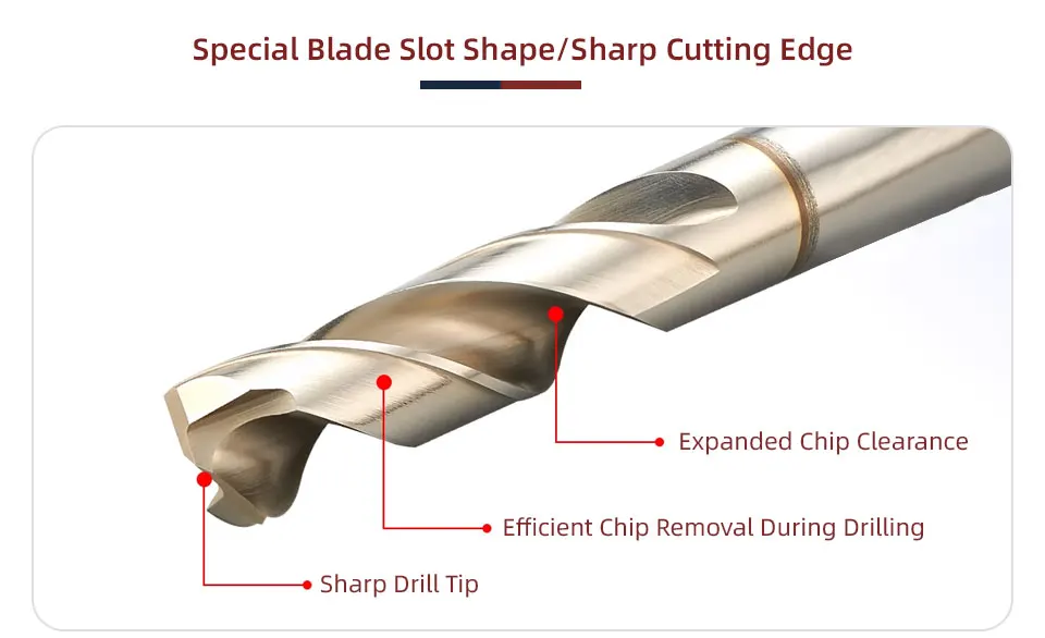 Sharp drill tip, expanded chip clearance, efficient chip removal during drilling, non-stick drill