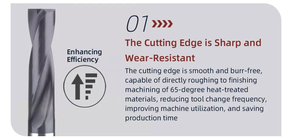 The cutting edge is smooth and burr-free, capable of directly roughing to finishing machining of 65-degree heat-treated materials, reducing tool change frequency, improving machine utilization, and saving production time